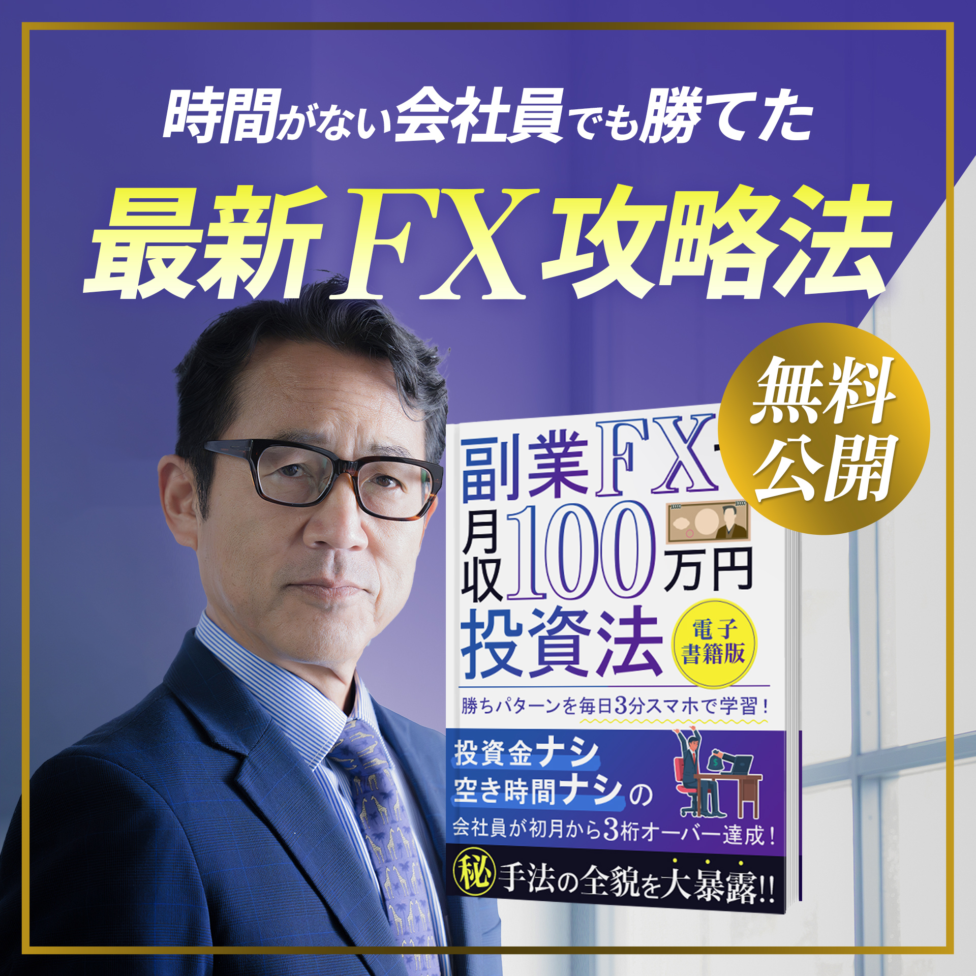 無料電子書籍版資料へ誘導 / FXに興味がある多忙な会社員層、具体的な高収入を目指したい人 / Facebook広告 / 「信頼感」と「具体的成果」を前面に押し出し、権威性を感じさせる。窓のようなデザインは未来への希望を表現。/ 紫・黄 / ターゲット層(会社員)が、人物を「成功した将来の自分」として投影しやすい。