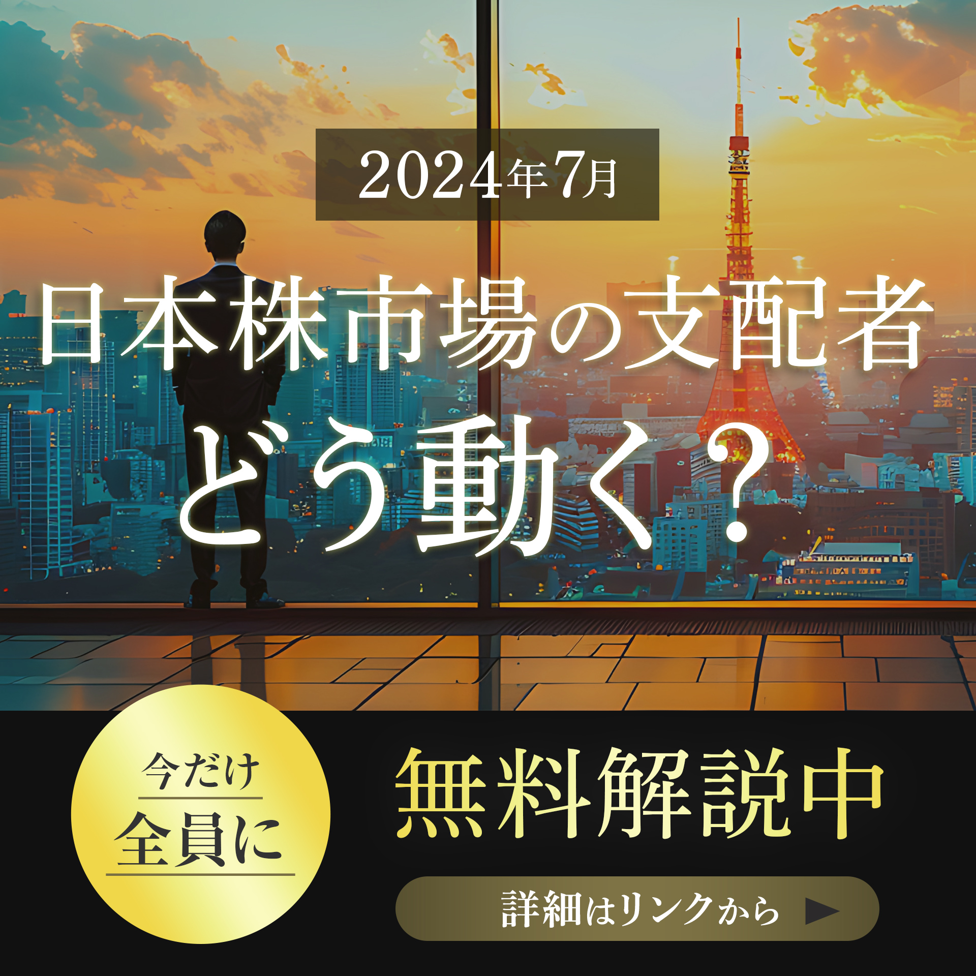 無料資料への誘導 / 日本の株式市場の動向に高い関心を持つビジネス層・投資家、市場の裏側に興味を持つ層 / Google広告 / 支配的な視点と未来への期待を、都市の風景と高級感のあるゴールドで演出、特別な情報であることを訴求 / 黒・金・オレンジ / 東京タワーを見下ろす構図で優越感を与え、黒で秘匿性、「支配者」の動きを知りたいという好奇心を刺激しクリックを促す。