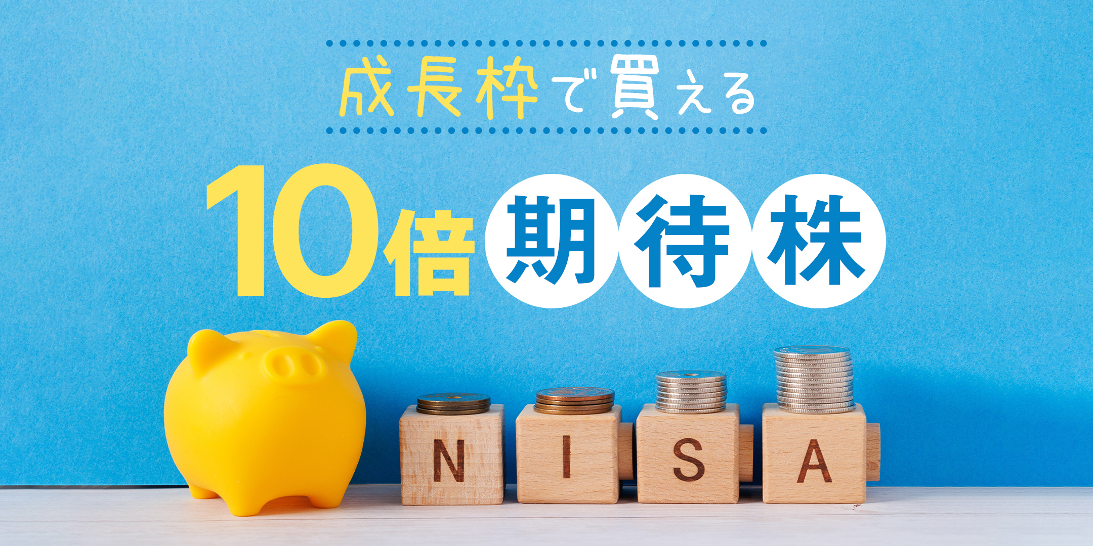 投資情報への誘導 / 新NISAを活用し始めた投資初心者、堅実さと大きなリターンの両方を求める層 / taboola広告 / 「可愛らしさ」と「手堅い投資」を組み合わせ、NISAの手軽さと期待値の高さを表現 / 水色・黄色・白 / 手書き風フォント、白丸背景による文字の強調で親しみやすさを表現し、「成長枠」「10倍」という具体的キーワードで利益への期待を高め、クリックを誘う。